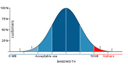 NetTrac® reserves the right to immediately block the traffic that does not fall with in the guidelines above or constitutes spamming, extraordinary traffic or disk usage, or constitutes in our sole opinion, objectionable content or generally fails to meet acceptable use of our services. Storage Services are for Web Site related content and content that is related to the operation of your business or enterprise. (99% of NetTrac® customers fall within disk and bandwidth that lie within ranges that have close proximity to each other. Those that statistically fall outside of these ranges are subject to surcharges or suspension of services.) Email accounts are subject to a limit of 200 MB per account however, while there are no quotas set to be consistent with our unlimited use policy, we reserve the right to suspend service to those who, in our sole discretion constitute abuse of our services. The images below show how 98% of our users fall within our acceptable bandwidth and storage use guidelines. Those that fall into the red "outlying" areas are susceptible to any of the above remedies. These policies shall apply to all type of hosting whether shared or dedicated.